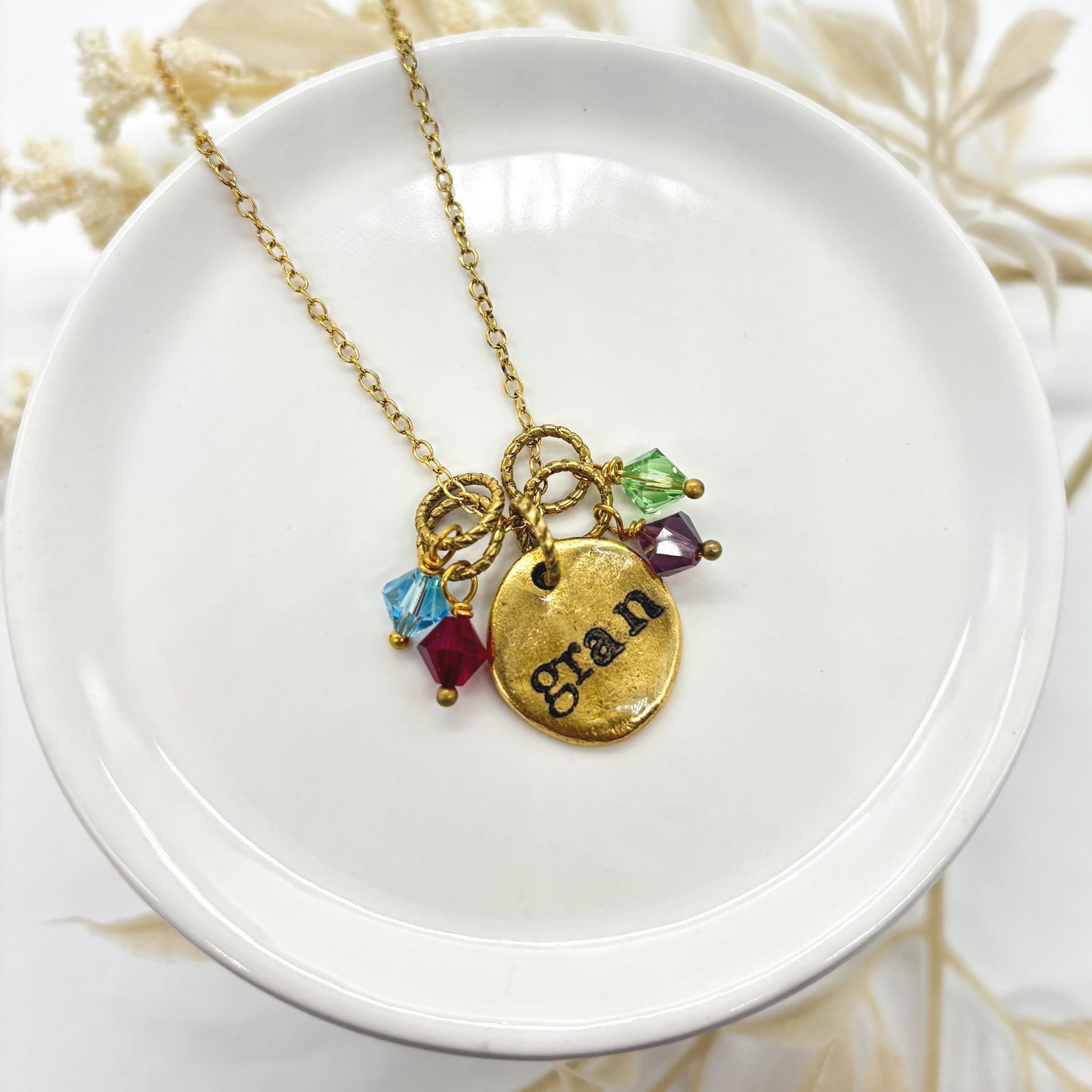 Looking for a sentimental gift that she'll actually wear every day? Celebrate the gran in your life with this versatile dainty gran birthstone charm necklace, available in elegant silver or warm gold finishes. The perfect gift for Mother's Day, birthdays, anniversaries, Christmas or any occasion honoring the special grandmas in your life. Personalize it with birthstones to represent each family member or add an initial and birth flower charm (links are listed below) for a meaningful touch that tells her unique story. This timeless piece combines sentimental value with sophisticated design, making it a treasured keepsake your grandma will wear with pride.