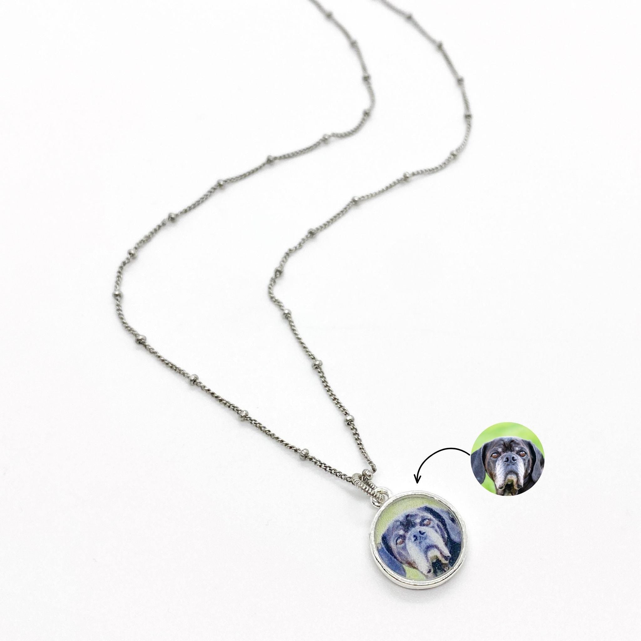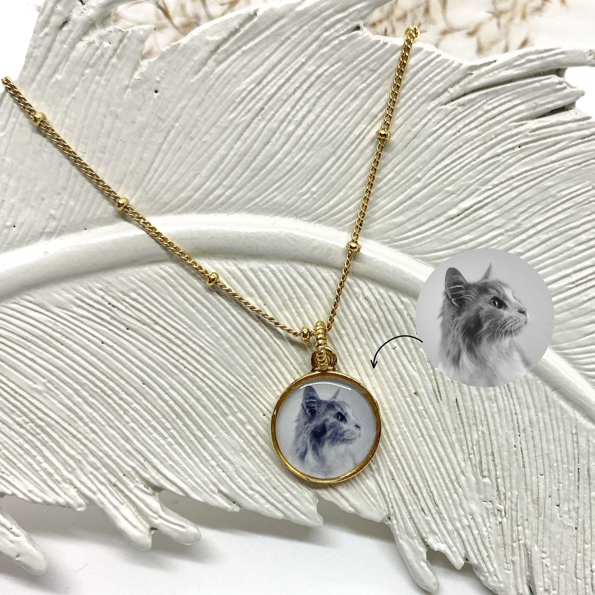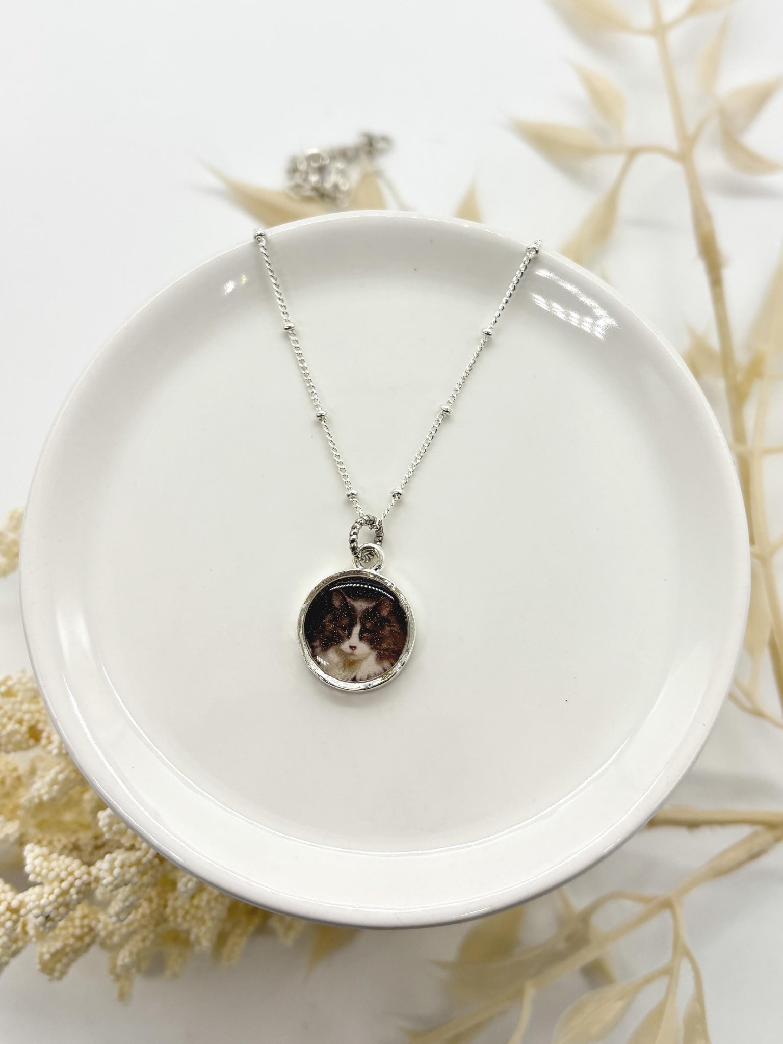 Celebrate the bond with your beloved pet or keep their memory close to your heart with this custom pet portrait necklace. This necklace is featuring a circular pendant with a vivid portrait of your cat that is set in resin for long lasting wear. This necklace is a meaningful way to keep your furry friend close to your heart. It also makes a heartfelt pet memorial gift, a thoughtful gift for animal lovers, or a stylish everyday accessory. This necklace blends sentiment with timeless design & is available in silver or gold finishes.
